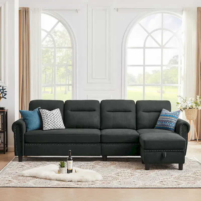 4 Seater L Shaped Reversible Nailed Sectional Sofa with Storage Ottoman