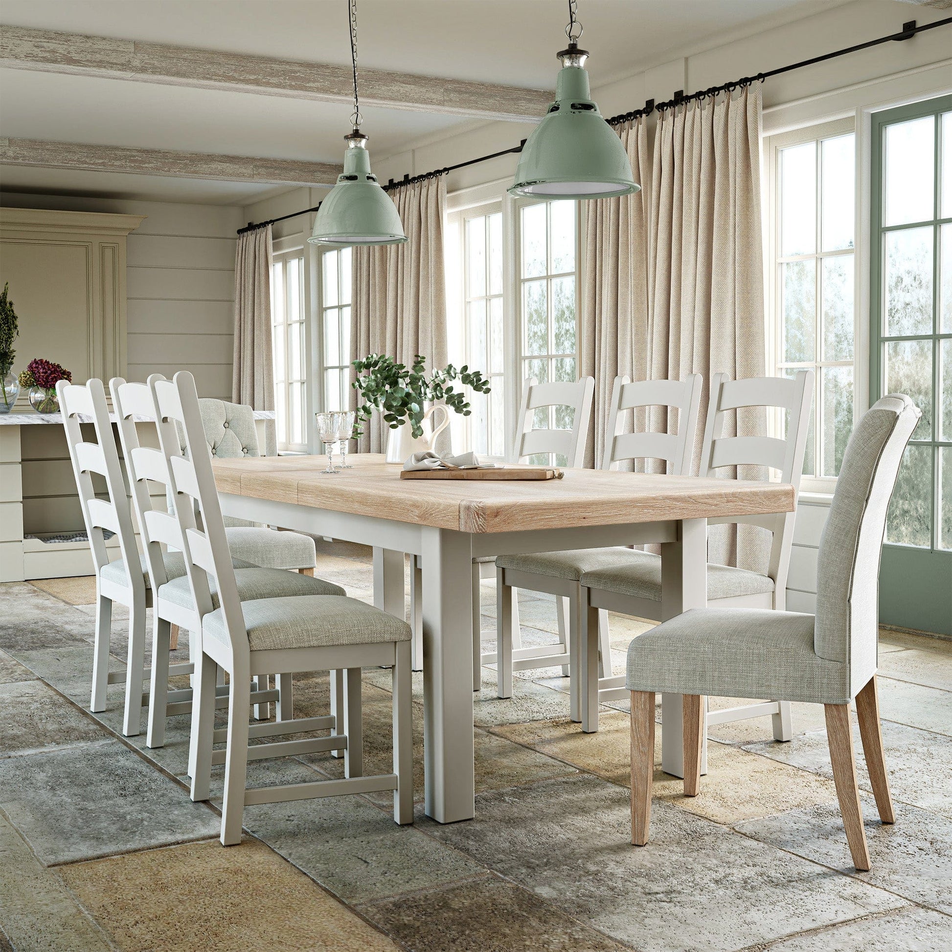 The Bantham dining range is as practical as it is stylish, combining classic elegance with a generous dash of contemporary refinement. Designed to bring together traditional design styles with modern interior ambiance, the range combines elements such as natural oak panels, whitewash oil finishes, and gorgeous neutral paint tones to create soothing and captivating dining room pieces. The Bantham extending dining table forms the basis of the collection, providing ample space for gatherings of all kinds. Coordinated pieces like Bantham console tables, sideboards, media units, coffee tables, and dining chairs add not only matching charm, but exceptional functionality as well.