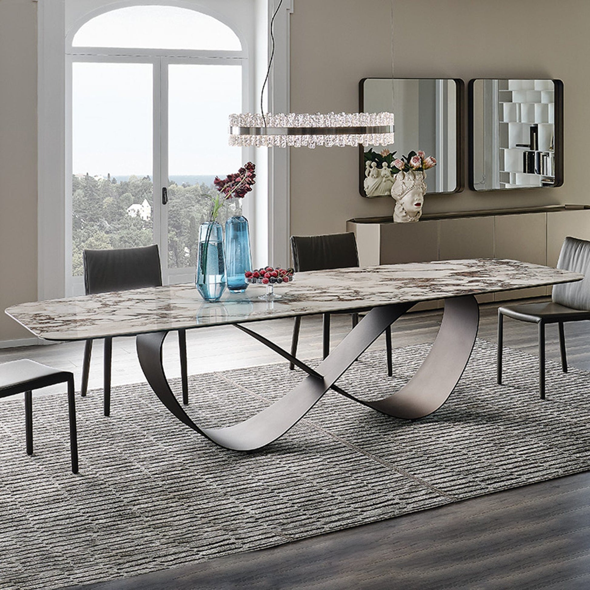The dining table is available in a range of sizes, both shaped and unshaped. It also features the range’s classic infinity loop ‘butterfly’ base in lacquered steel, as well as a durable ceramic top that is capable of bearing significant weight and hosting any celebration you require it to.