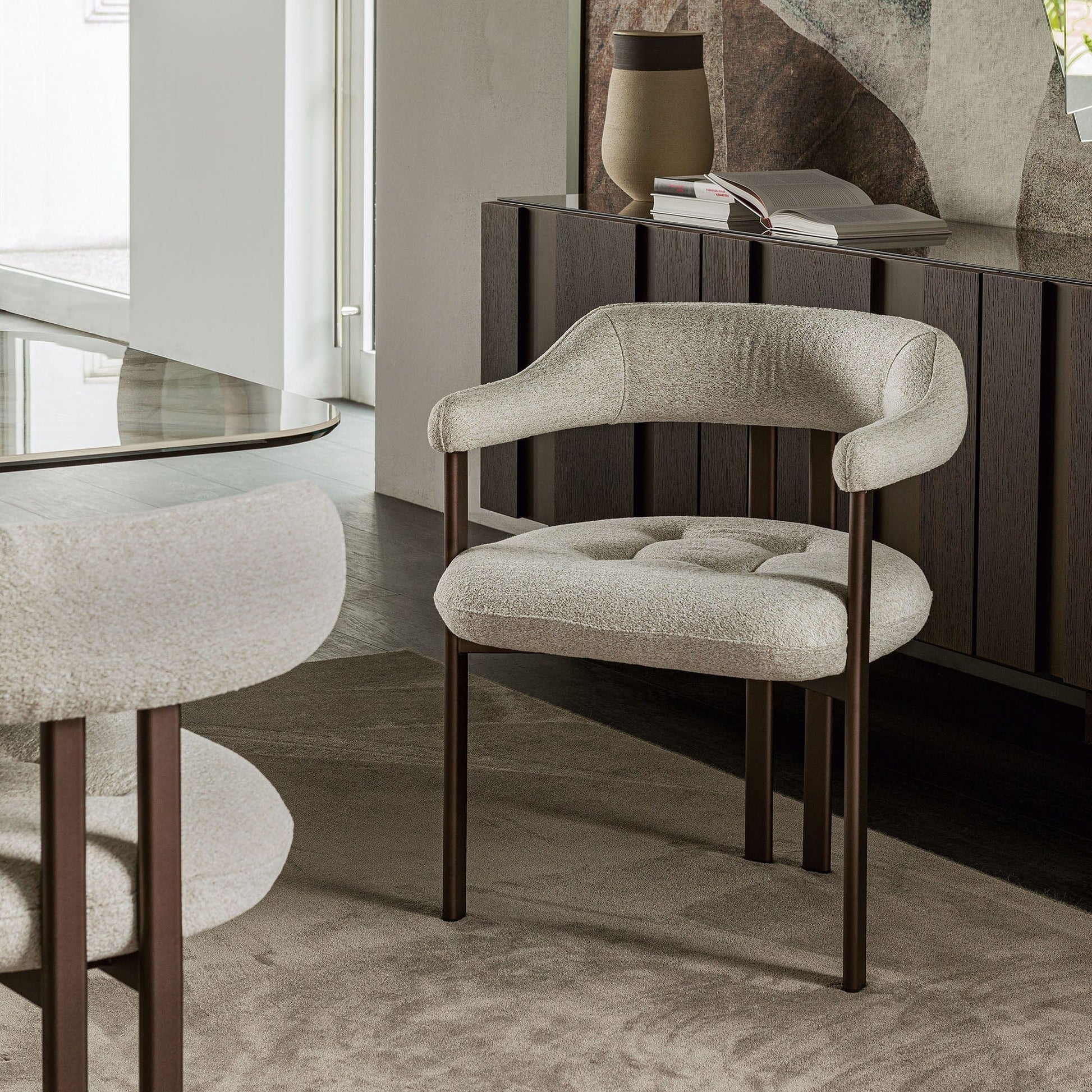 The Greta armchair is a modern chair with upholstered armrests. Its uniqueness lies in the division between the seat part and the wrap-around cushion, which joins the back to the armrests. This hollow structure makes the cushion very large and comfortable, decorated with four stitches that create a soft and refined capitonné effect. The floating backrest on this designer armchair is also soft and comfortable, consisting of a curved, contoured cylinder that wraps around the back, ending in comfortable upholstered armrests. An intriguing interplay of contrasts is created between the seat and the base, superimposing soft and metallic materials, solid and empty volumes, cosy and sharp contours. The three slender legs are formed by metal tubes with an elliptical cross-section, finished in textured varnish in a variety of elegant shades to match the wide range of fabrics and leathers in the sample collection. The central leg at the back of this modern dining armchair is actually two legs placed close together to create a single point of support. The vertical space in the centre plays on the concept of solid and empty spaces between the backrest and seat. The result is a cohesive design that conveys an overall feeling of lightness and balance.
