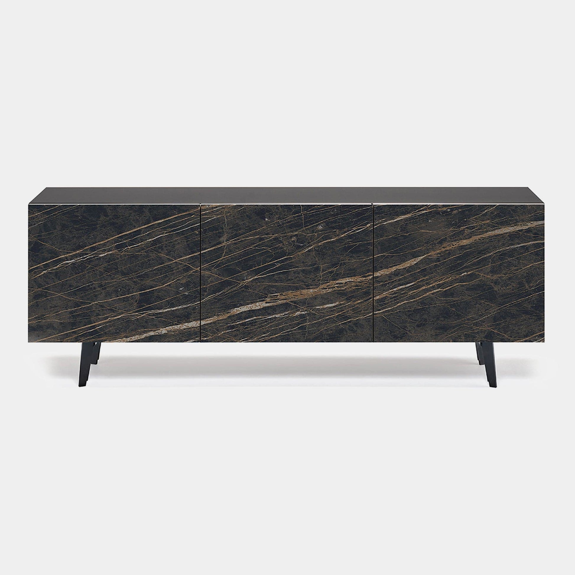 The three door sideboard is hallmarked by its sleek lacquered wood panelling, its embossed steel base, its marble-effect ceramic doors, and rows of clear glass internal shelves for ample storage space. Solving your personal storage needs has never looked so stylish.