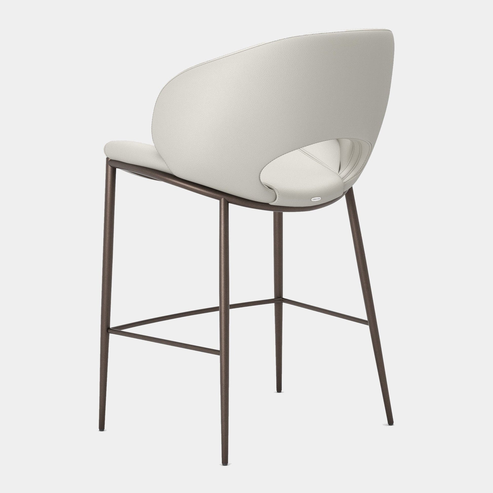 The Miranda bar stool is packed with bespoke details, crafted with the utmost care and precision. The seat and backrest, modelled like two complementary shells, have a polygonal shape, enhanced by rounded edges and gentle curves. This stool is also enhanced by soft ripples, like waves on the shore, which accentuate the feeling of comfort. The seat part has a distinct and welcoming curvature, which is further accentuated by the embossed stitching that matches the leather or fabric: a touch of elegance that highlights the craftsmanship with which it is made.