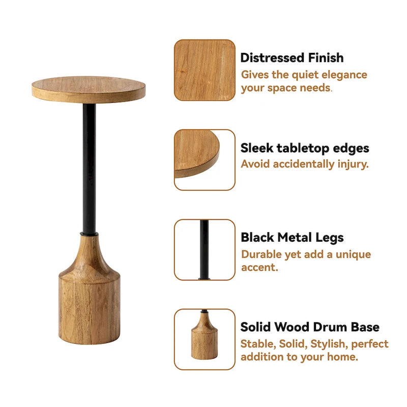 Add rustic charm to your living room with the COZAYH Farmhouse Pedestal End table. Its natural wood texture and pedestal legs set on a drums base make it a prominent addition in classic and farmhouse style interiors. Made with a durable MDF wood top, metal legs, and a solid wood base, this drinking table is well-made and sturdy. With easy three-step assembly, it's perfect for professional or leisure purposes and displays your favorite items. Ideal for small spaces, this round martini table is a graceful and practical addition to your home decor.