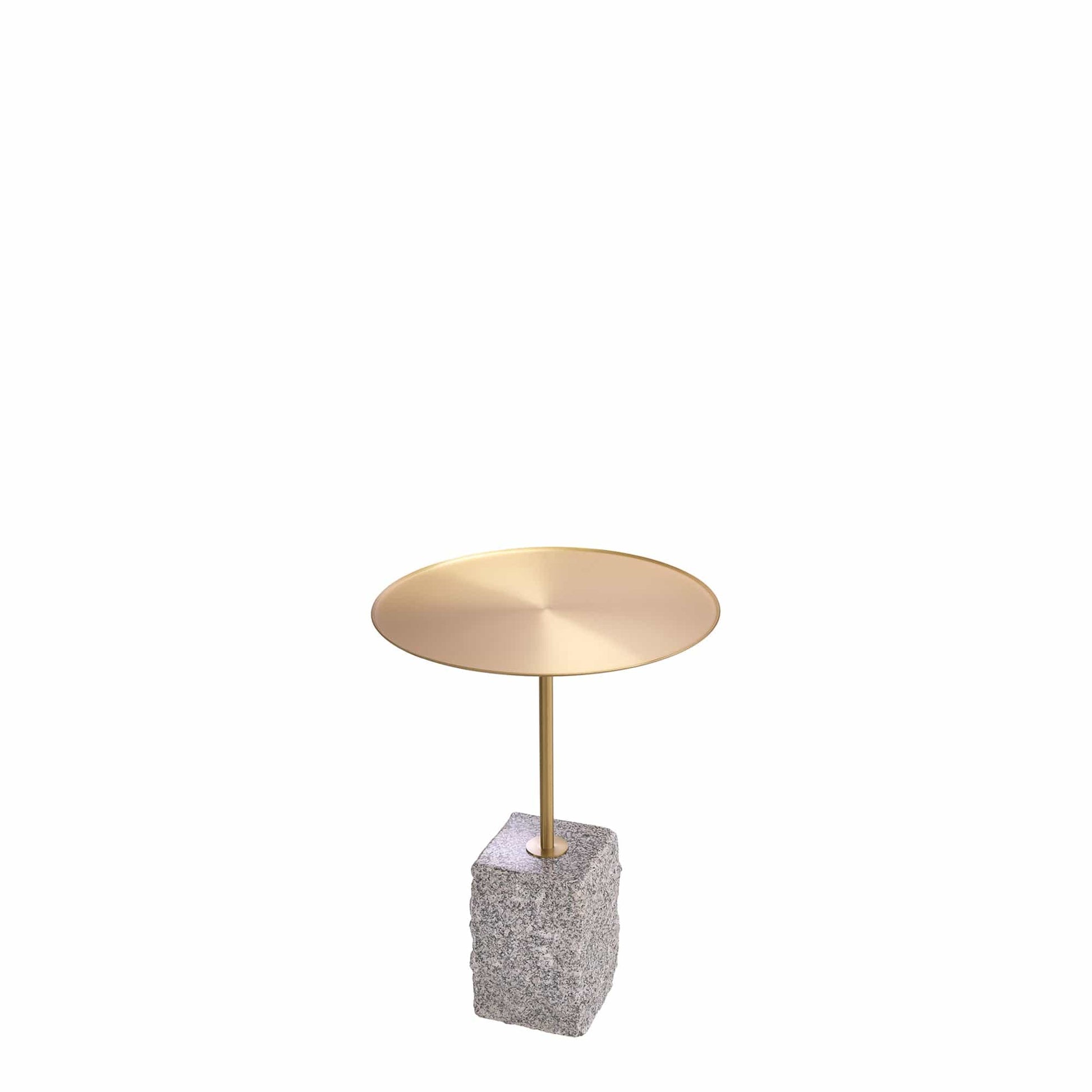 Cole Side Table is all about simplicity and natural appeal. The round brushed brass table top is embellished with raised edges. It sits on a sleek stem which firmly rests on a block of grey granite with rough, unpolished sides, giving it a tough yet elegant look.
