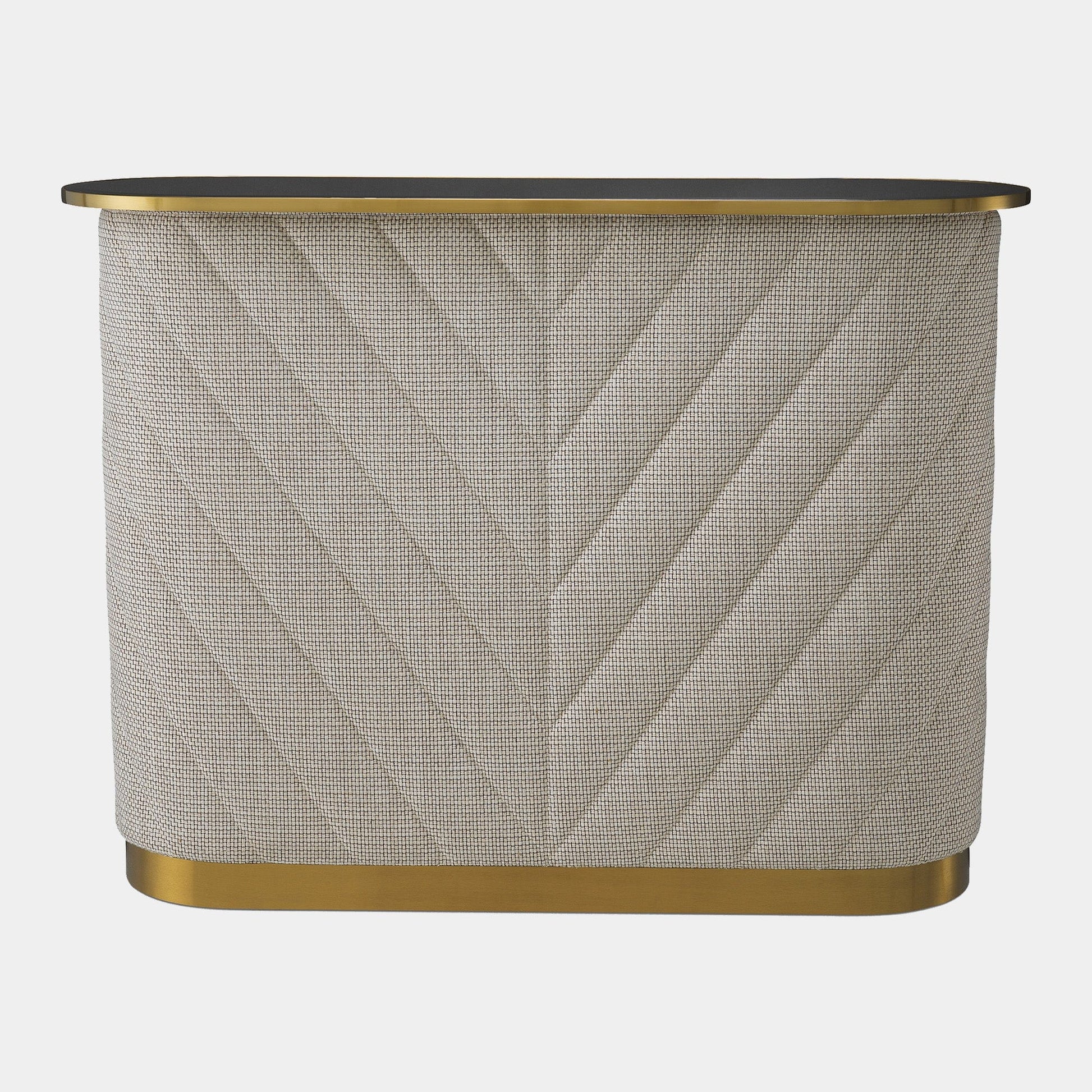 Elevate your space with the Eichholtz Matthew bar unit in opulent off-white fabric. This luxurious piece features the lush Forrester fabric, perfectly complemented by a sophisticated brushed brass finish and sleek black glass top. Its refined elegance and timeless design make it an ideal choice for those seeking unparalleled style in high-end interiors.