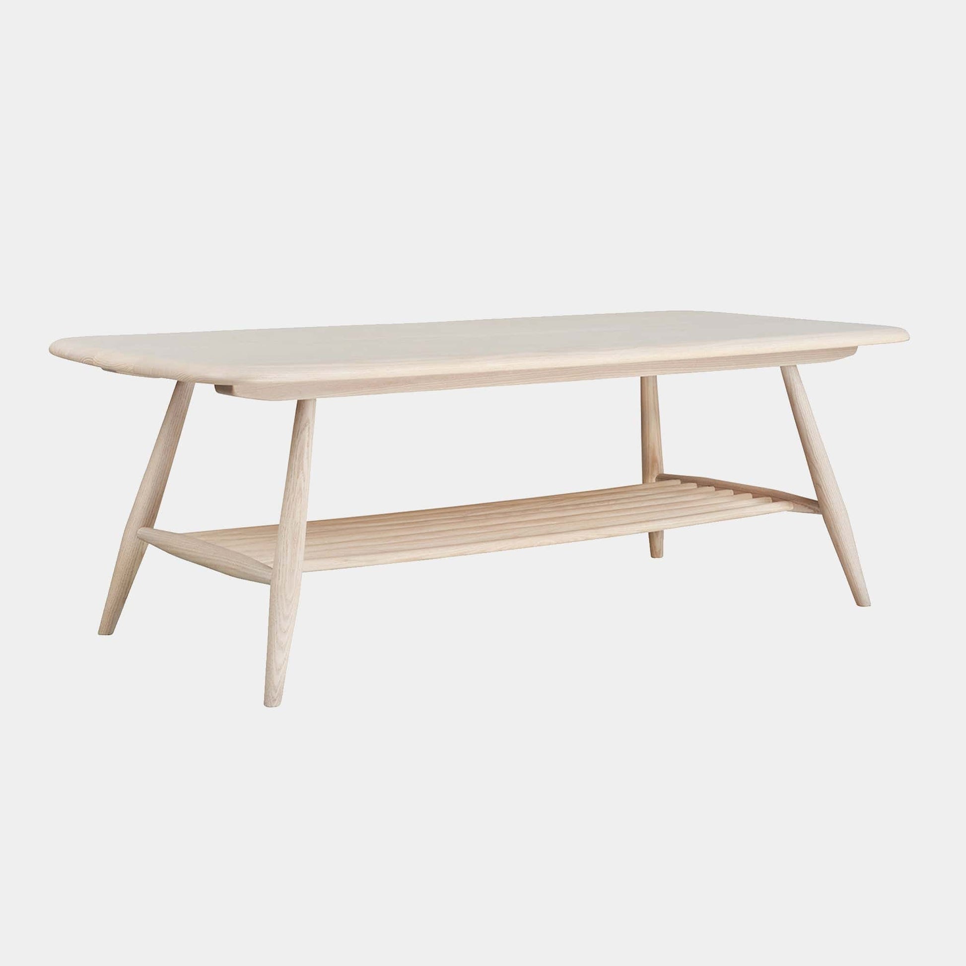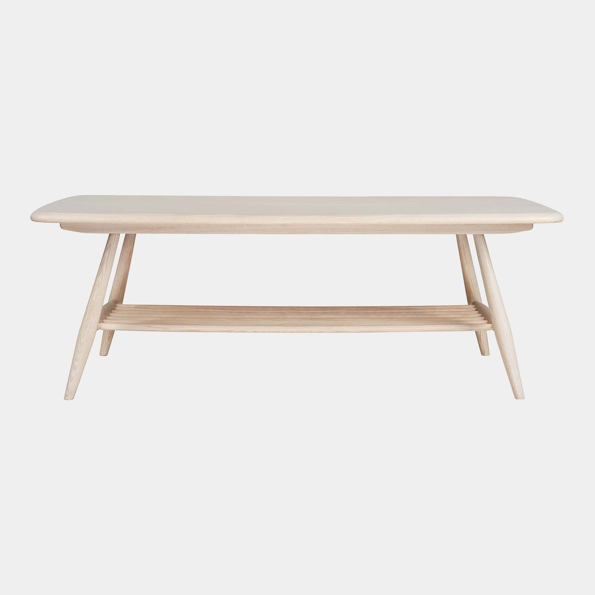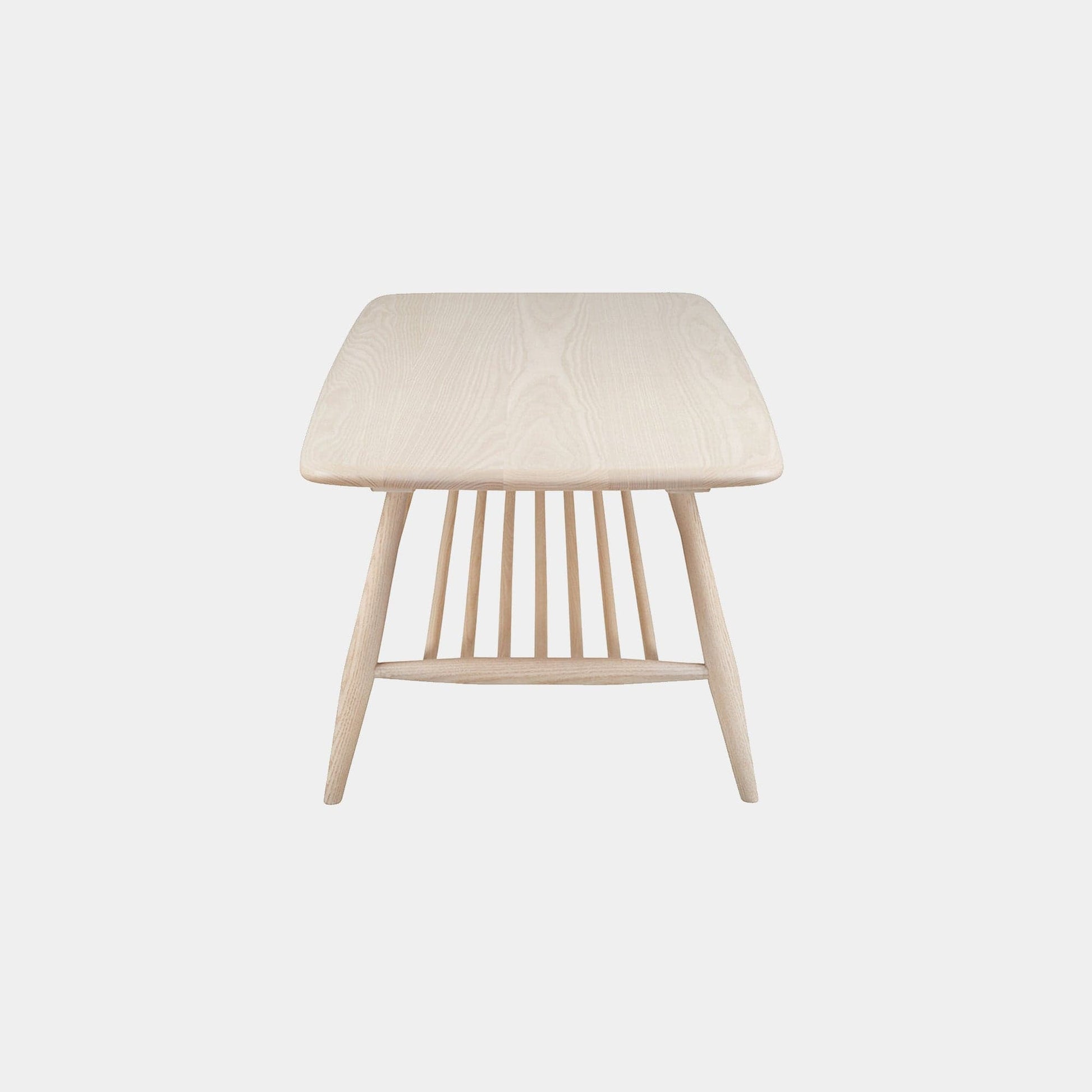 This mid century design of ercol collection coffee table has a smooth organic shaped surfaced with the added detail of individually shaped spindles that construct the lower shelf. First produced in the 1960's this table is as practical as ever with a handy storage area for books and magazines. This table can be finished in your choice from a range of lacquer finishes that both protects the timber, whilst enabling you to choose the look to match your style and decor.