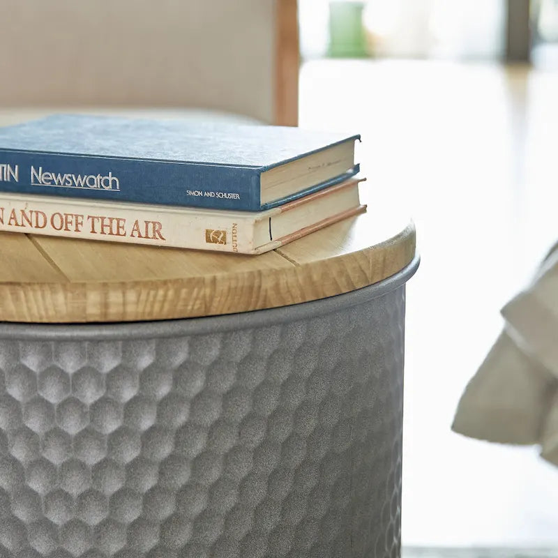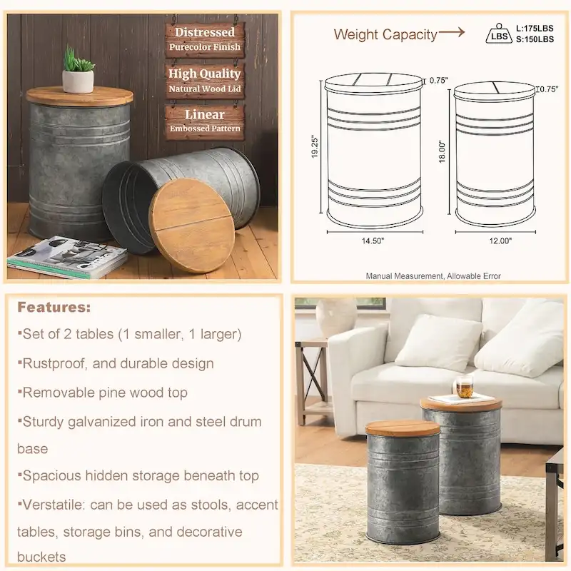 Add some rustic charm to your home decor with this set of two farmhouse nesting end tables that double as storage stools. These industrial-style tables feature sturdy galvanized steel bodies and warm honey-finished pinewood lids that are removable for easy access to ample storage space. Use them as side tables, coffee tables, or bedside tables to keep your books, blankets, games, and toys organized and within reach.