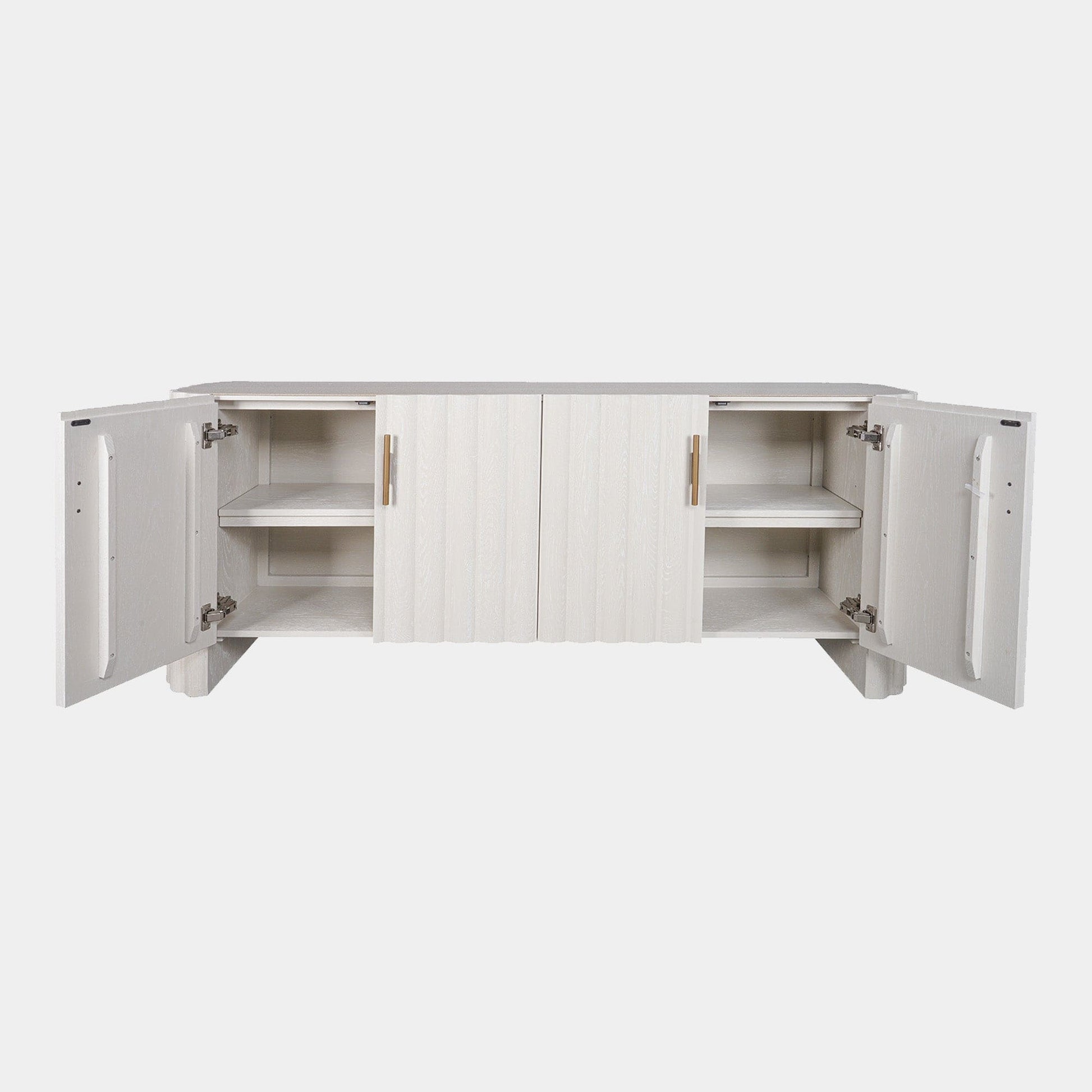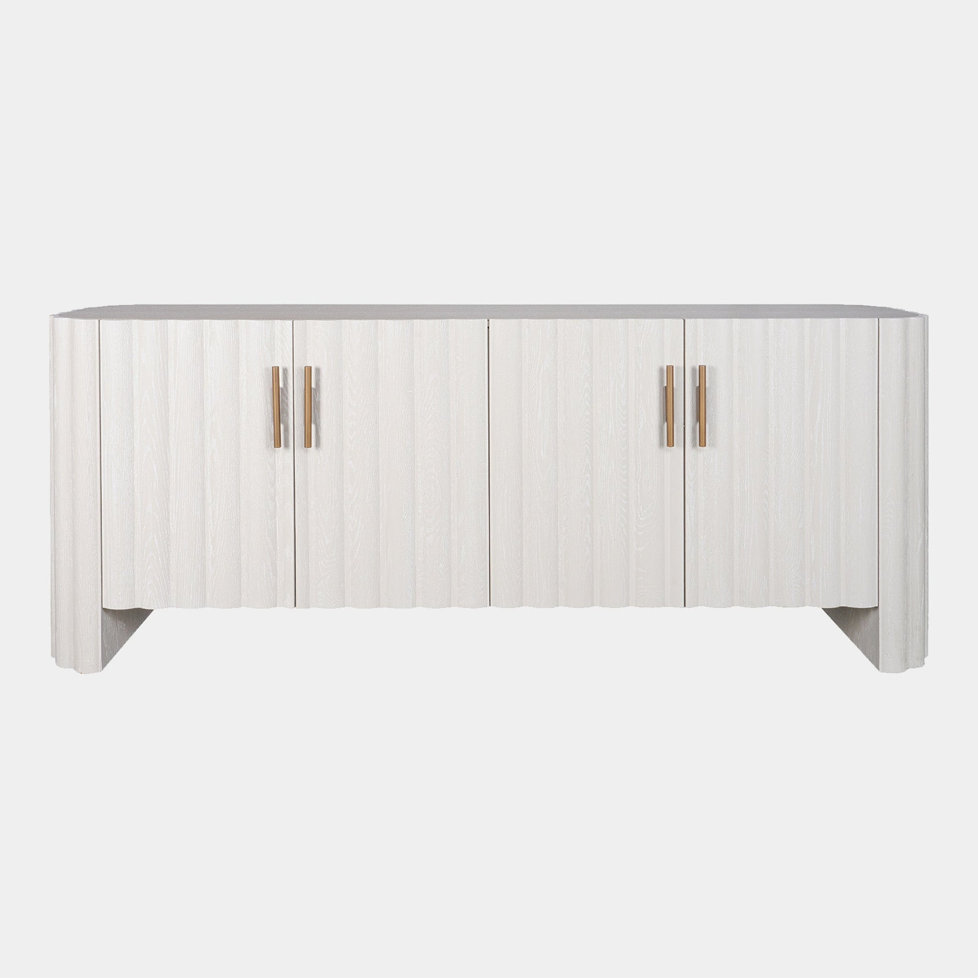 The Harmony 4 door sideboard is a true talking piece, featuring a ribbed design and finished with vertical brushed brass handles. The sideboard contains two shelves to provide ample storage space.