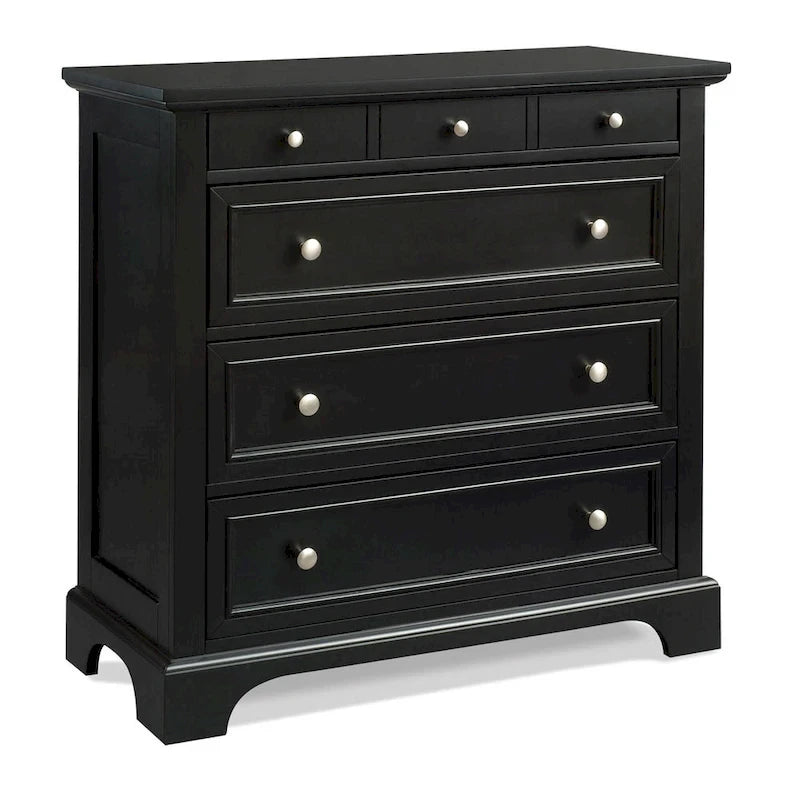 Complement your home and make it stylish with the homestyles Bedford Queen Wood Panel Three Piece Bedroom Set in Black. The three-piece bedroom set is a unique bed set constructed with popular hardwood and engineered wood with a multi step ebony black finish. The exclusive queen bedroom set features rails, headboard and footboard with raised panels. The nightstand has one storage drawer and lower open storage to keep bedtime essentials within reach. The complete bed set provides great comfort in all seasons ensuring a good and healthy sleep. The four drawer chest is large and matches the elegant design for your room dcor. Beautiful, brushed nickel hardware completes the look.