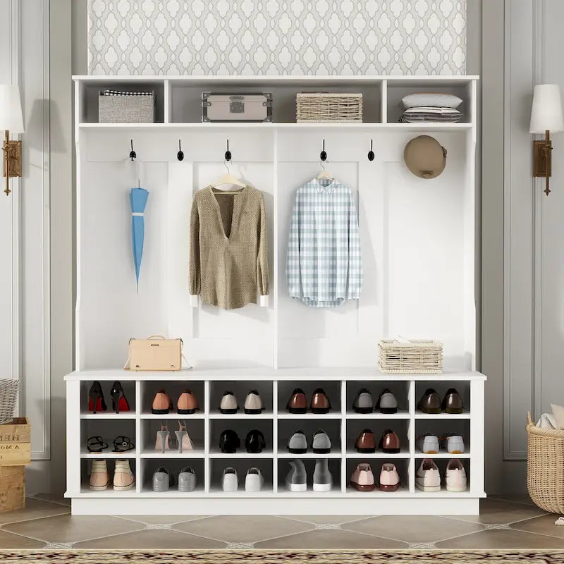Large Hall Tree for Entryway Coat Rack Shoe Bench with Bottom Storage