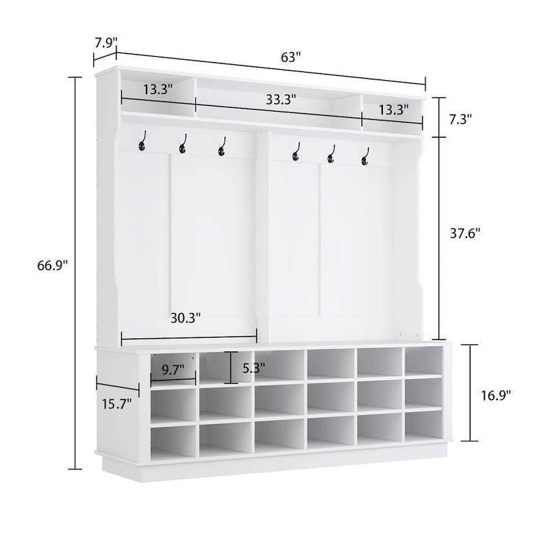 Transform your entryway into a functional and stylish space with this Large Hall Tree. Its modern design features clean lines and multiple storage options to keep your belongings organized. With 18 shoe compartments at the bottom and six metal hooks on top, you'll have plenty of space to hang your jackets, hats, and scarfs while storing your shoes. The wide bench on top of the shoe storage offers a comfortable spot to sit while you change your shoes. Made from high-quality materials, this product is built to last and will seamlessly match any decor style.