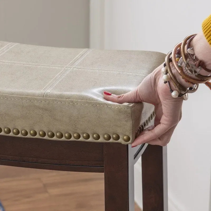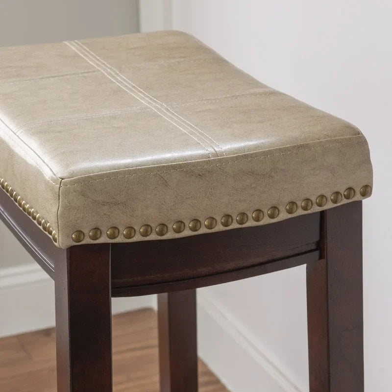 Add a touch of elegance and sophistication to your dining area with the Linon Willamette bar stool. This sturdy and stylish backless barstool features a dark brown wood finish and beige faux leather upholstery with accent stitching, brushed bronze nail-heads, and cross-support footrests. With its warm color palette, it complements any home decor and can be easily tucked away when not in use.