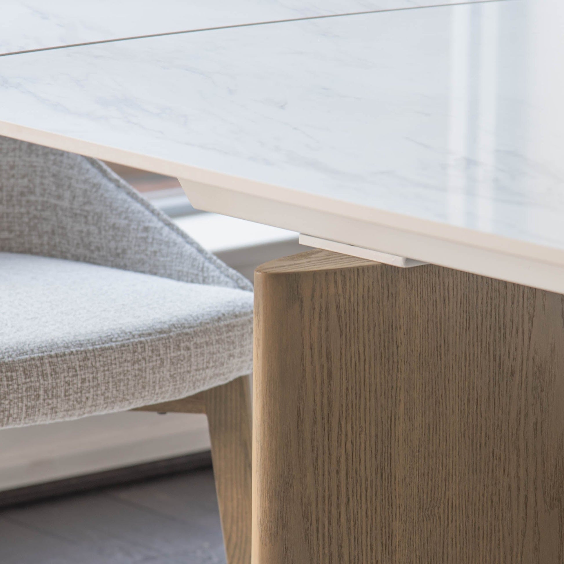 The Lucerne collection embodies a neutral modern design, exuding on-trend minimalist style perfect for today’s homes. Crafted with a white marble effect sintered stone top and grey ash finish legs, this extending dining table adds sophistication and elegance to any modern dining space. Ideal for both everyday meals and entertaining guests, the extendable feature provides flexibility, comfortably seating family and friends with ease. The combination of sleek surfaces and clean lines makes the Lucerne table a stunning centerpiece in any dining room.