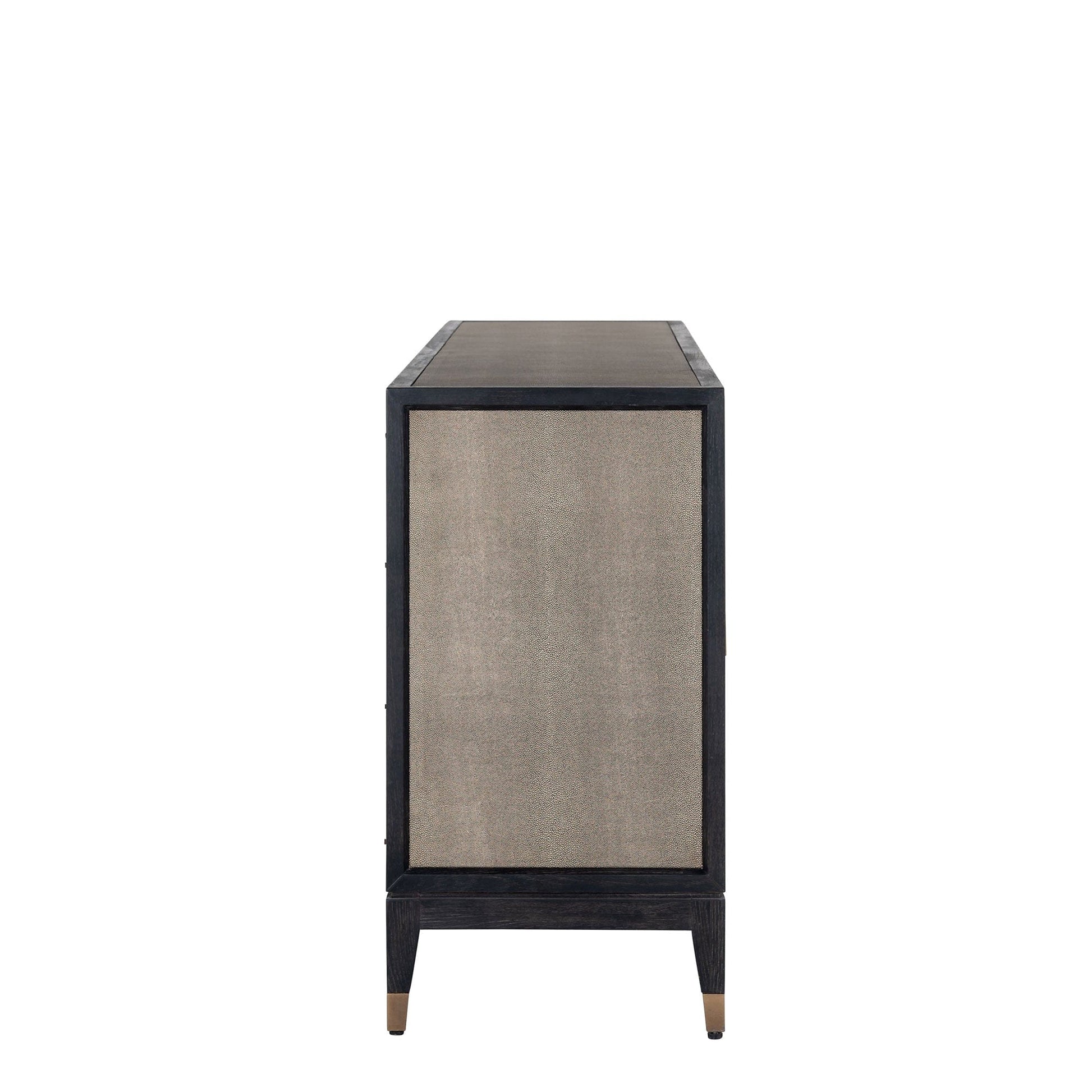 A splash of matte gold trim adds an elevated look to the Ridgeville collection, bringing a modern, luxurious touch to your home design. A dramatic contrast to the dark oak legs, gold trims provide a balancing mix of style and luxury. With its elegant shagreen finish, crafted from faux PU leather, the Ridgeville brings a unique, charm to any room. This collection blends modern sophistication with a luxurious feel, creating an inviting space that feels like a true retreat. Not only does it look beautiful, but it's easy to maintain offering both style and function. A whole line of coordinating pieces means you can easily coordinate the perfect set for your room.