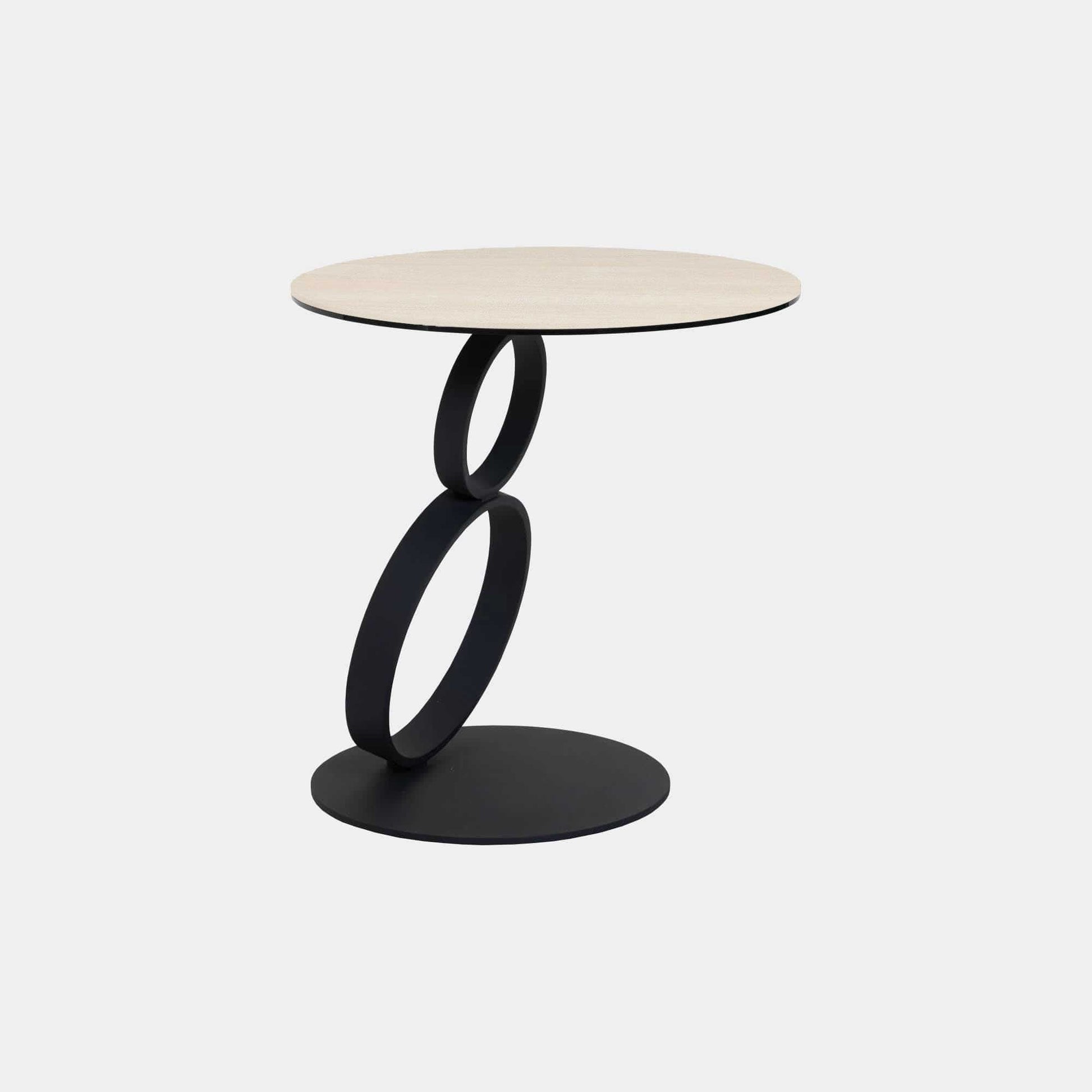 The Rimini Side Table features a contemporary sculptural design, with a pair a bold charcoal powder coated hoops supporting the ceramic table top, providing a refreshing surface which will complement and enhance any contemporary space.