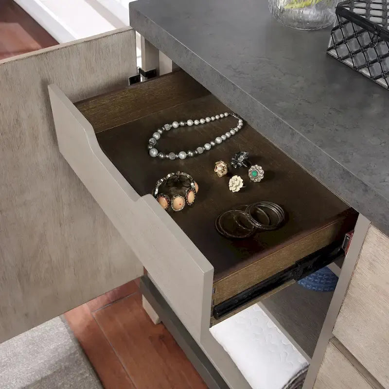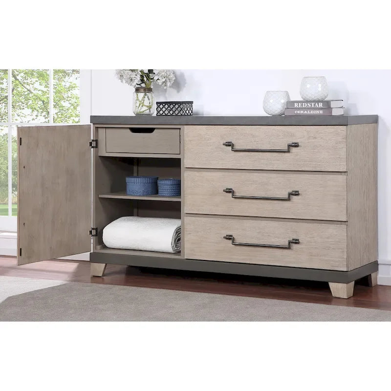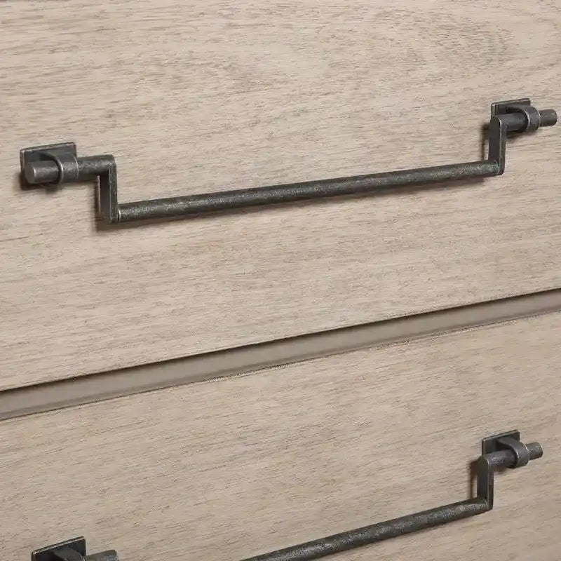 - Panel drawer fronts complemented by brushed edges and sleek distressed gunmetal finish hardware, the drawers feature metal ball bearing side guides